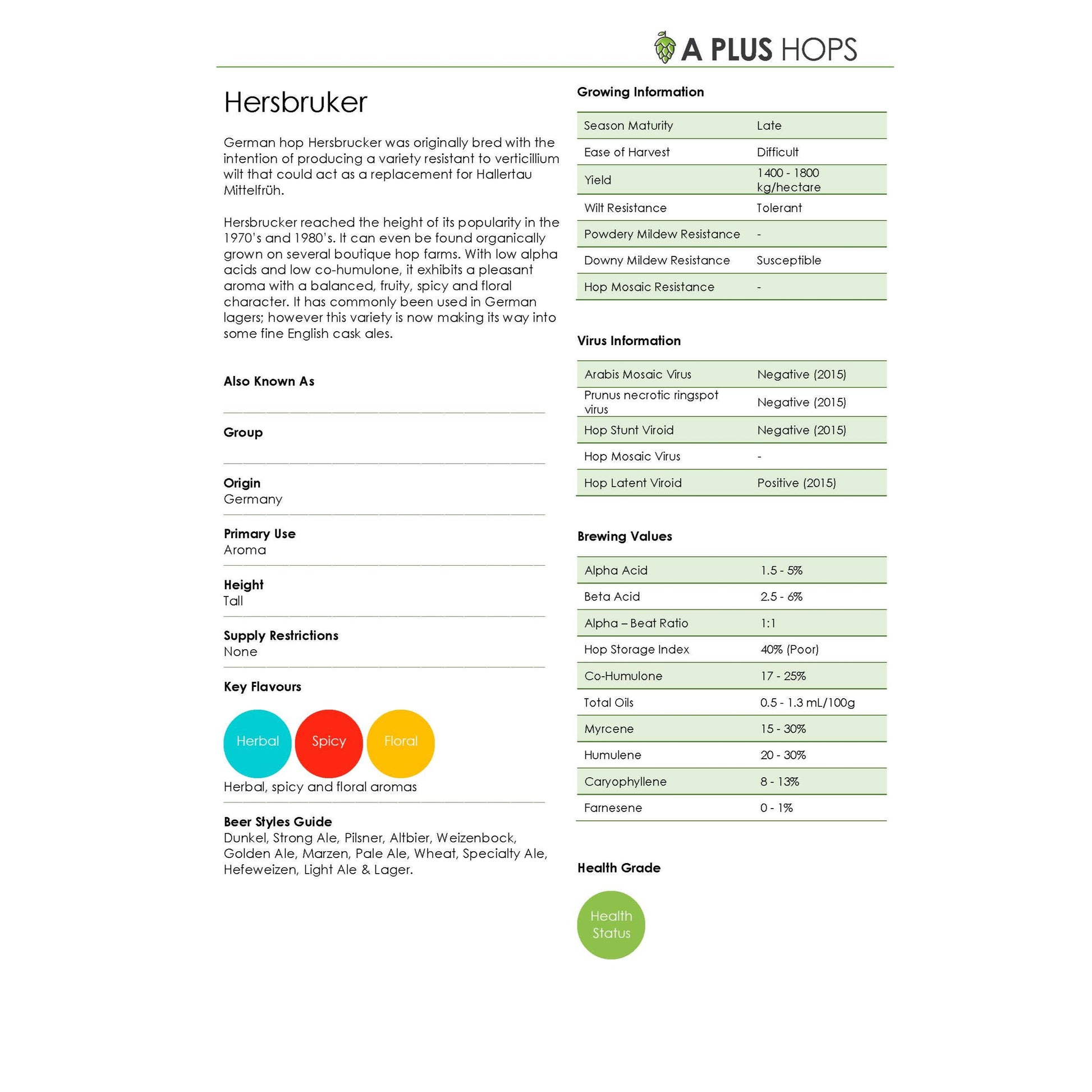 German hop Hersbrucker was originally bred with the intention of producing a variety resistant to verticillium wilt that could act as a replacement for Hallertau Mittelfrüh.