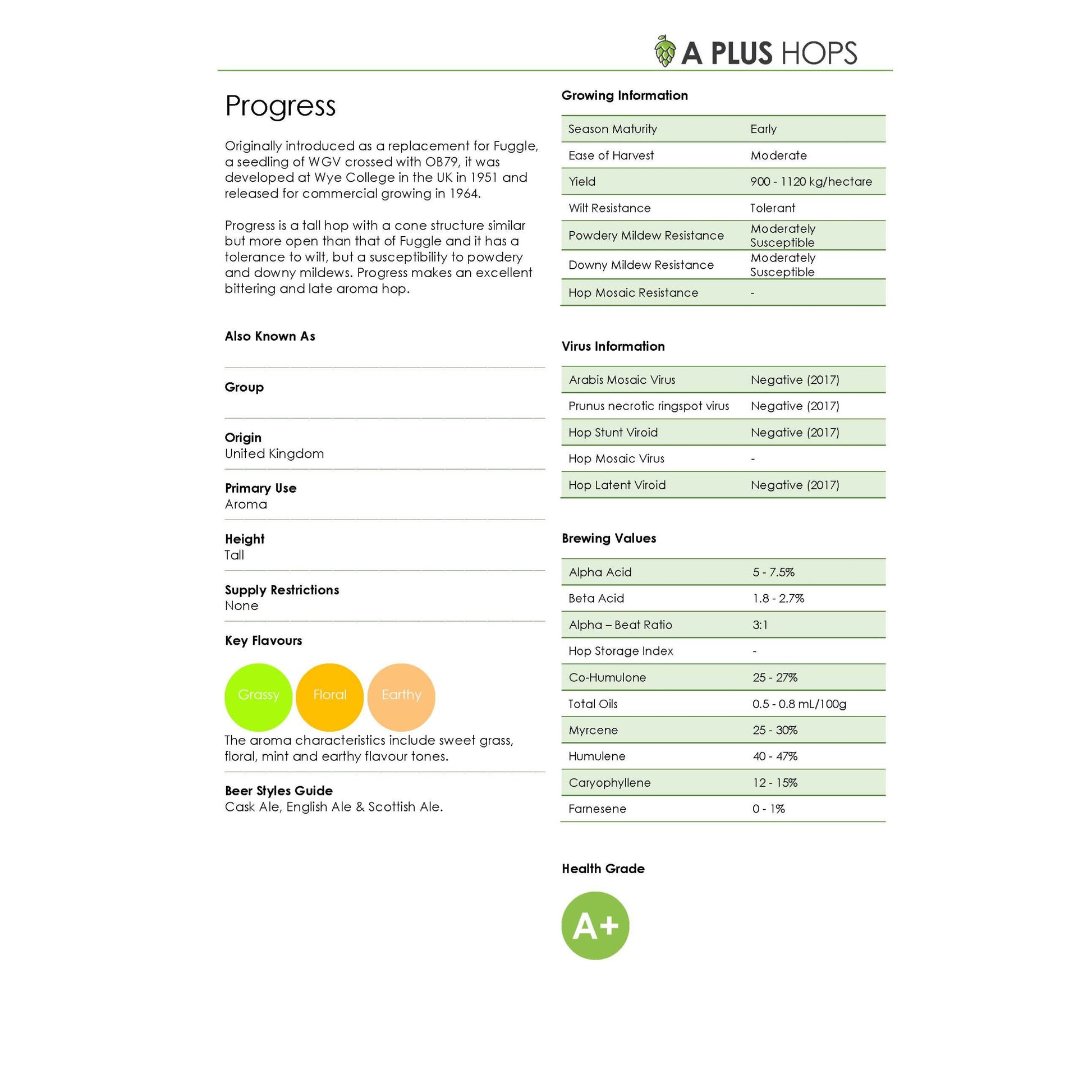 Progerss was developed at Wye College (a daughter of WGV) and released for commercial production in 1964. Generally grown as a substitute for Fuggle in areas hit by wilt, it has many of the same qualities but in essence has a slightly sweeter sometimes lime fruit character which creates a softer bitterness. Excellent for pale ales, lighter bitters, wheat beers and porters. It has been used in Hop Back's Thunderstorm; Wood Brewery's Hopping Mad.